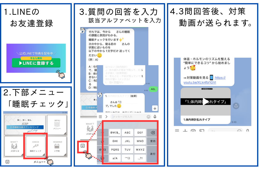 友だち追加後、下部メニューの「睡眠チェック」ボタンをタップすると、睡眠タイプチェックが届きます。